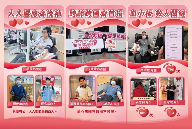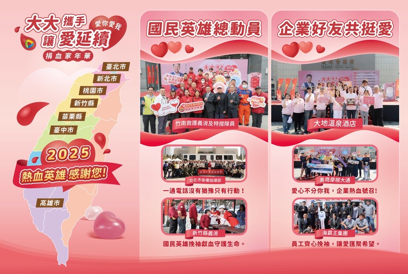 捐血活動由台北市、新北市、桃園市、新竹縣、苗栗縣、台中市及高雄市7縣市接力響應,感謝許多國民英雄及企業好友熱血號召一同加入捐血行列,臺北市後輩指揮部、竹南救護義消及特搜隊員們,一通電話沒有猶豫挽袖獻血,把保家衛國的精神延續為守護生命的溫柔行動。而企業好友們也愛心不落人後,感謝大地溫泉酒店 王雪梅董事長、美商摩根大通台灣區 錢國維總裁、海霸王集團 莊自立董事長及聯聚建設等企業員工都齊心挽袖,讓愛匯聚希望令人感動。